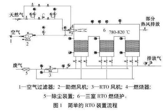 有機廢氣經(jīng)過蓄熱室時被加熱到760℃以上,使廢氣中的VOCs在氧化室內(nèi)氧化分解成CO2和H2O。氧化產(chǎn)生的高溫氣流經(jīng)特制的陶瓷蓄熱體,使陶瓷體升溫而“蓄熱”,此“蓄熱”用于預(yù)熱后續(xù)進入的有機廢氣,從而節(jié)省廢氣升溫的燃料消耗。陶瓷蓄熱體應(yīng)分成兩個(或兩個)以上的區(qū)或室。每個蓄熱室依次經(jīng)歷蓄熱一放熱-清掃等程序,周而復(fù)始,連續(xù)工作。